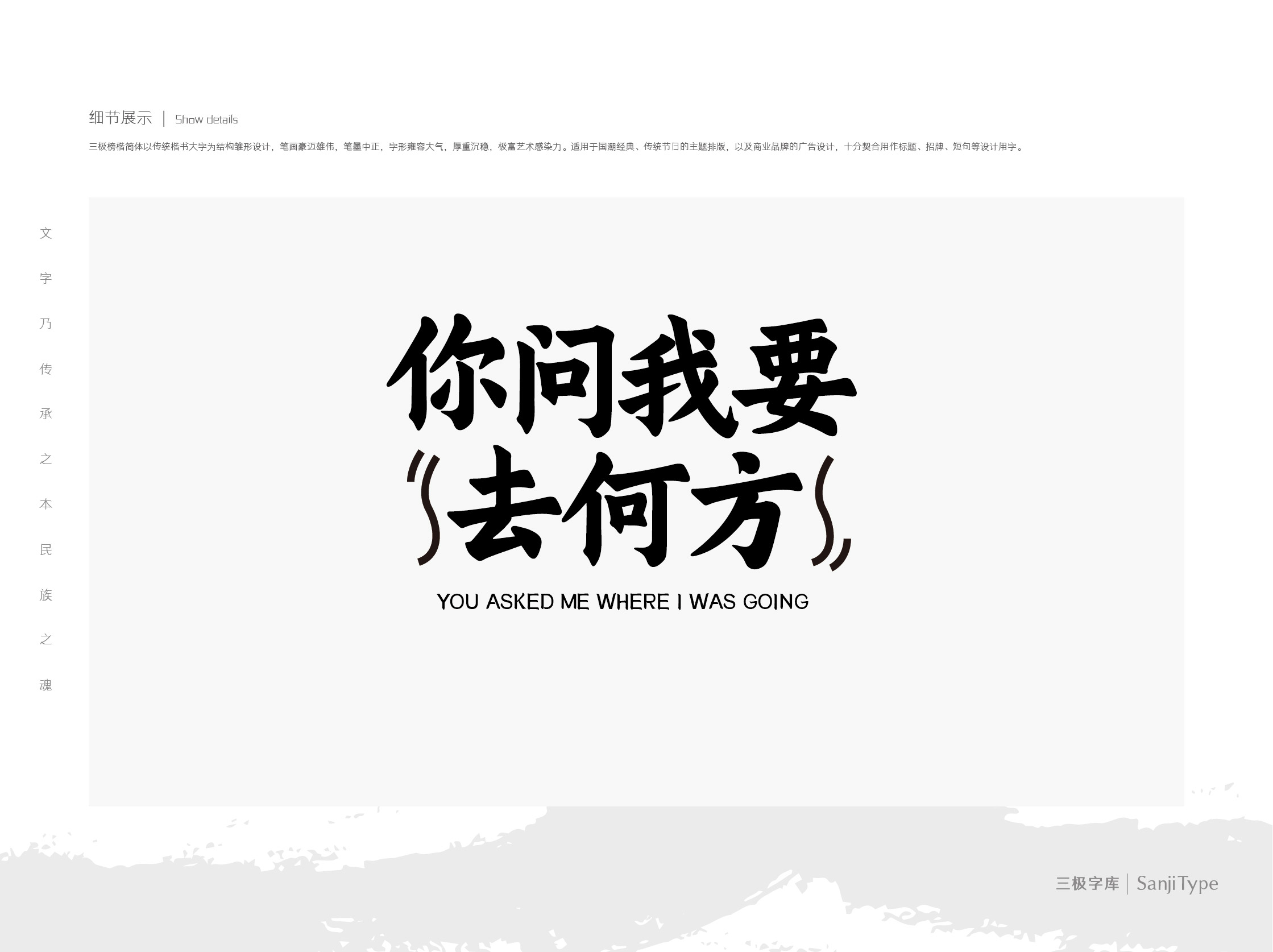 三极榜楷简体以传统楷书大字为结构雏形设计,笔画豪迈雄伟,笔墨中正,字形雍容大气,厚重沉稳,极富艺术感染力。适用于国潮经典、传统节日的主题排版,以及商业品牌的广告设计,十分契合用作标题、招牌、短句等设计用字。