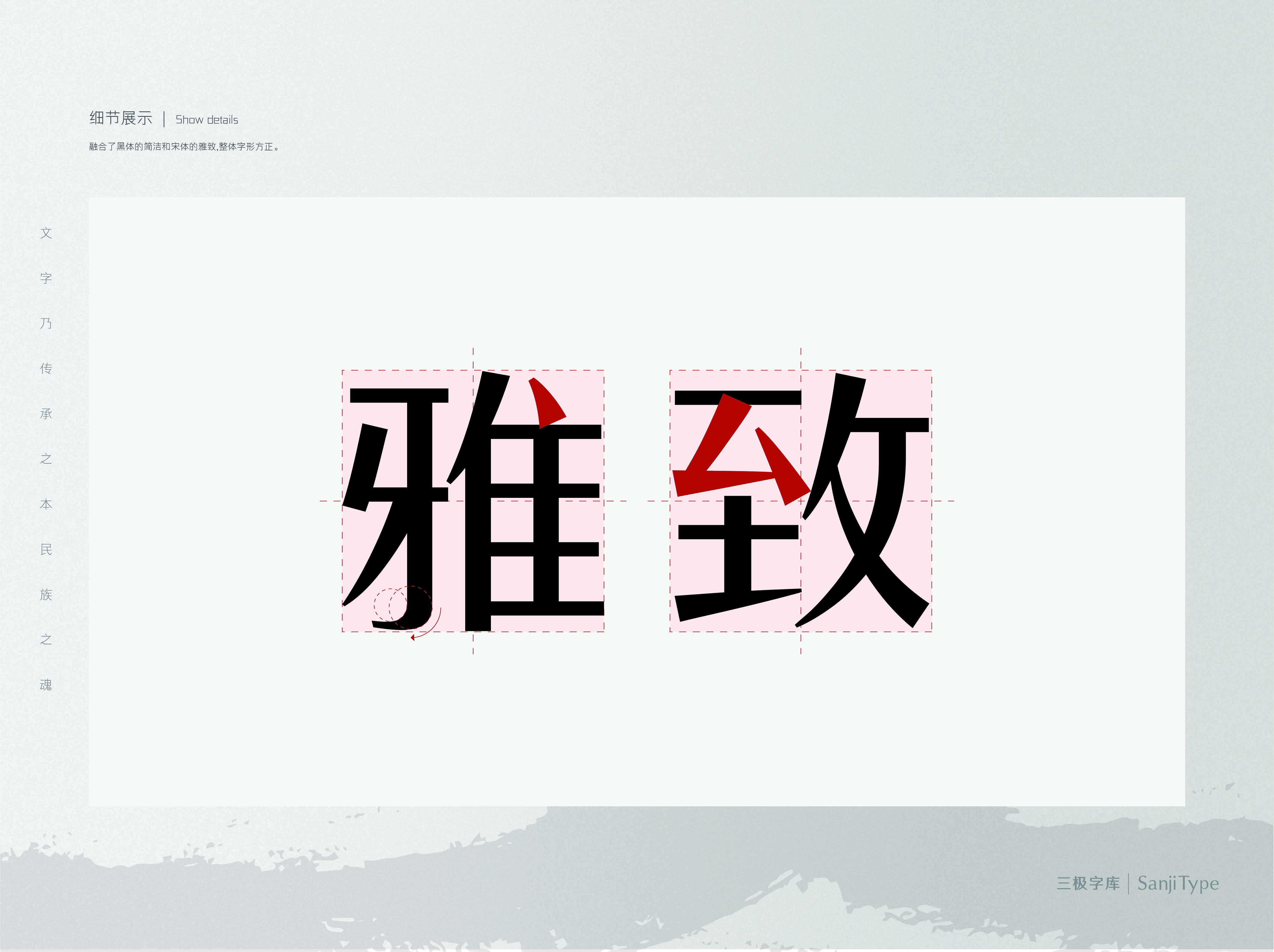 三极和悦宋黑融合了黑体的简洁和宋体的雅致,简约中带有细节变化。整体字形方正,笔划制作精良,刚柔相济,简洁有力。三极和悦宋黑拥有六款字重,可以适配正文和标题的排版使用。在书刊出版、产品包装、商业广告等多场合下,也能应用自如。